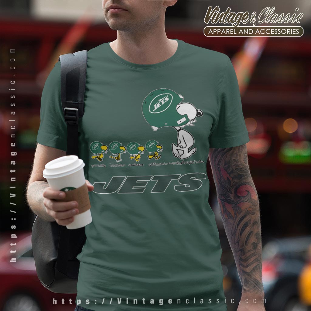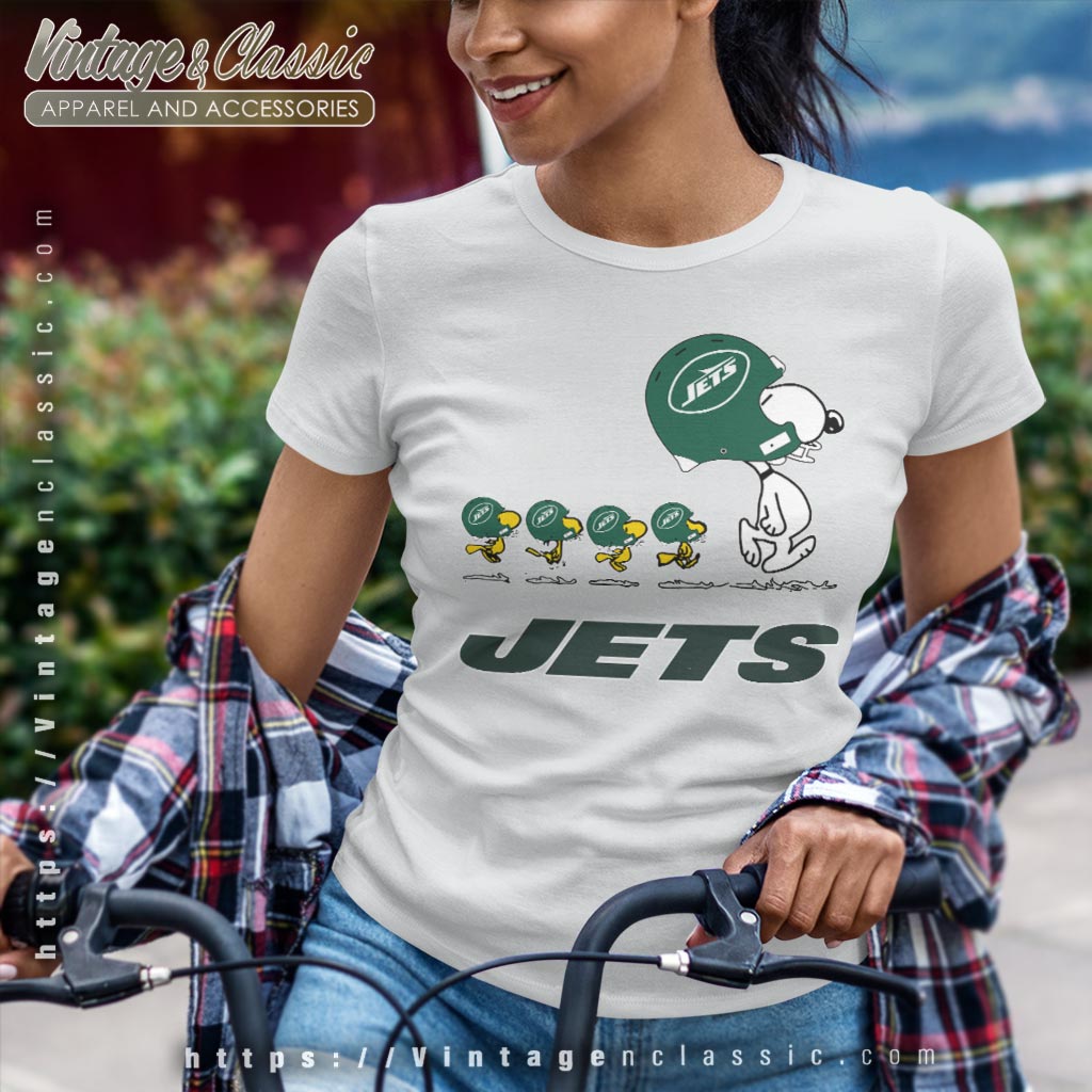 Related keywords: New York Jets t-shirt; Snoopy Jets fan gear; Woodstock Jets apparel; Peanuts football shirt.