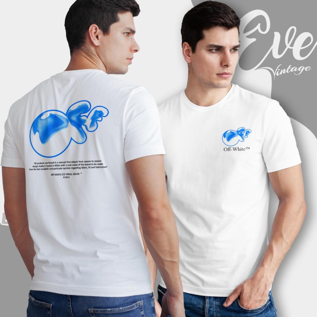 related keywords: Off-White bubble logo shirt, Off-White blue typography tee, Virgil Abloh graphic design shirt, Off-White conceptual lettering apparel