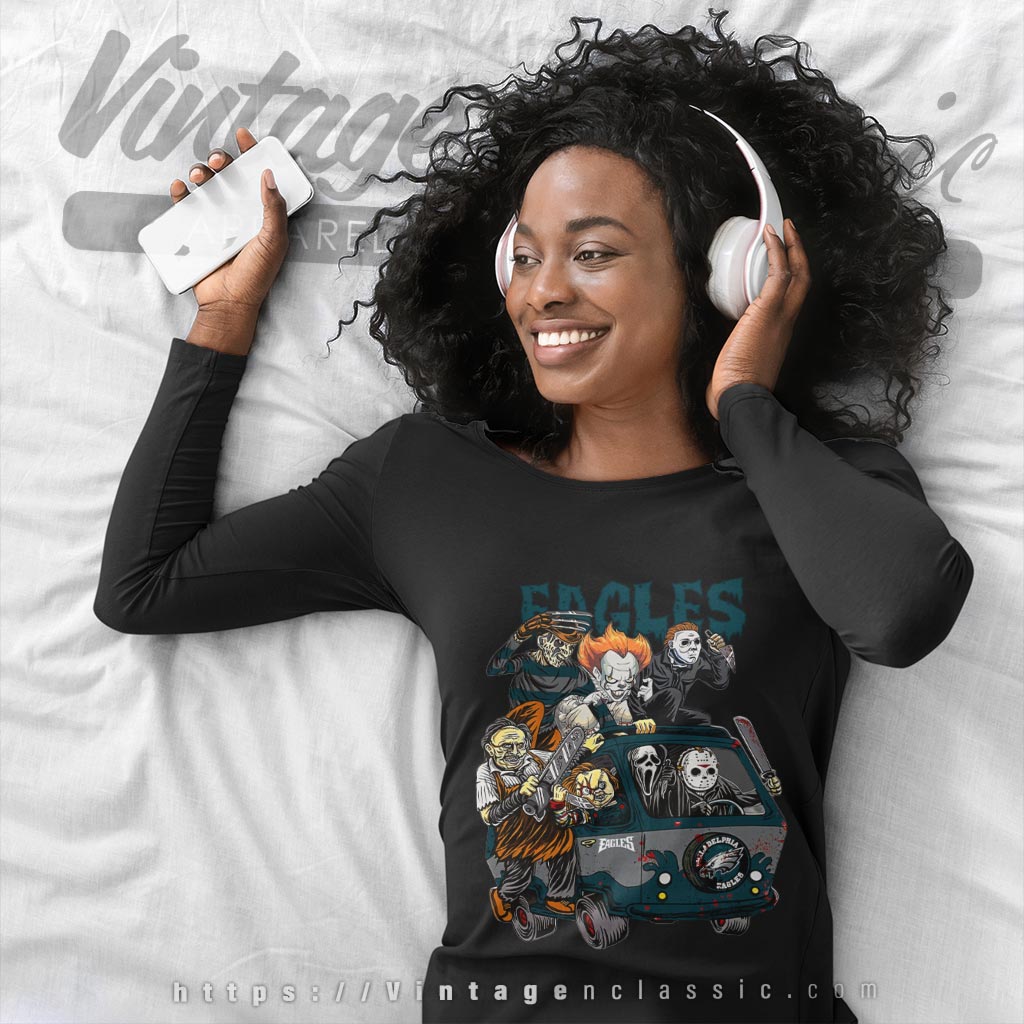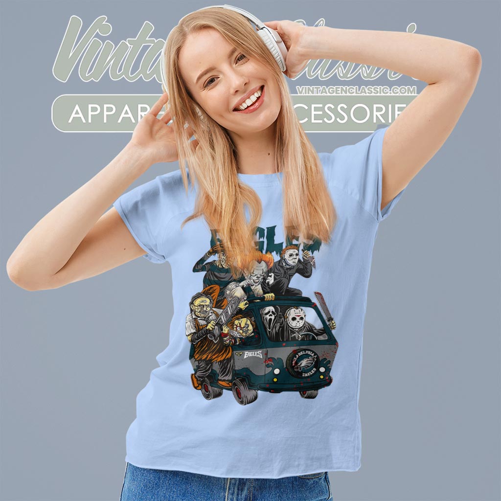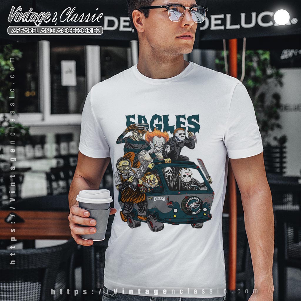 related keywords: Philadelphia Eagles horror characters Halloween shirt, Eagles Pennywise Freddy Jason tee, horror villains Philadelphia Eagles fan shirt, Halloween Eagles slasher van design