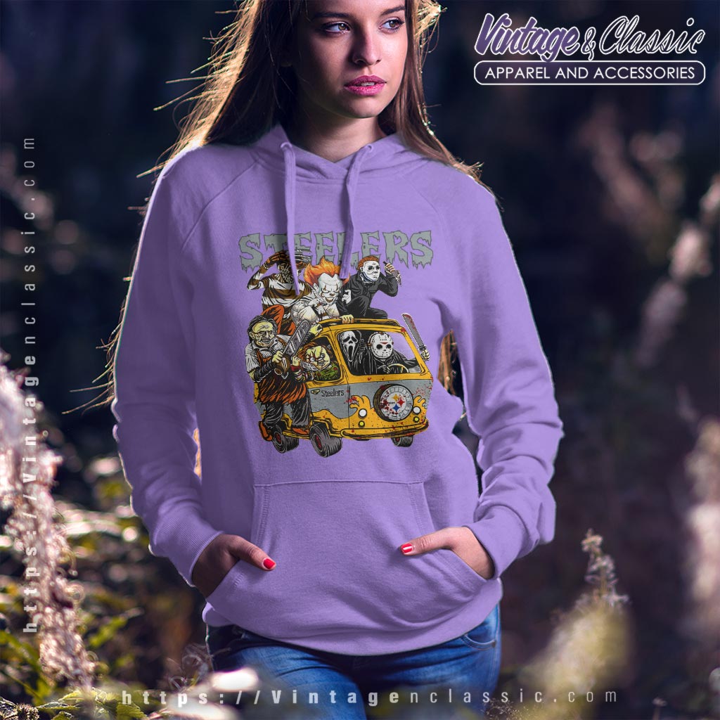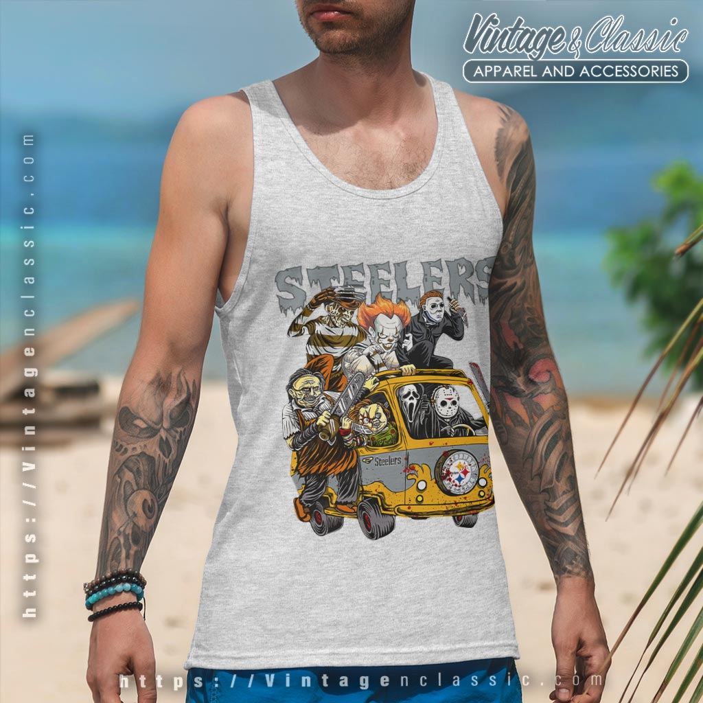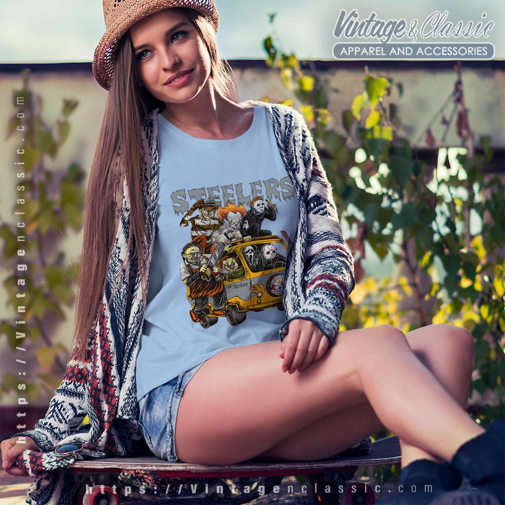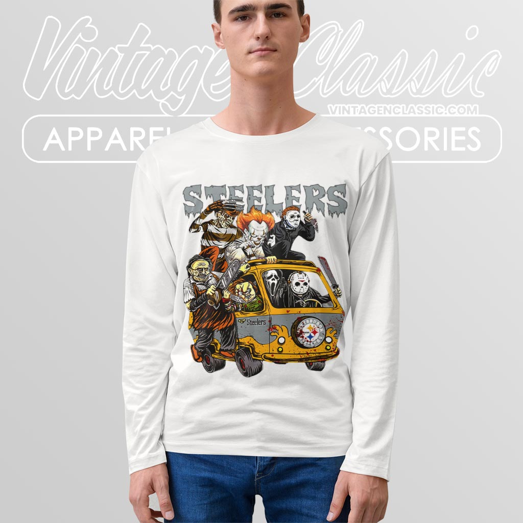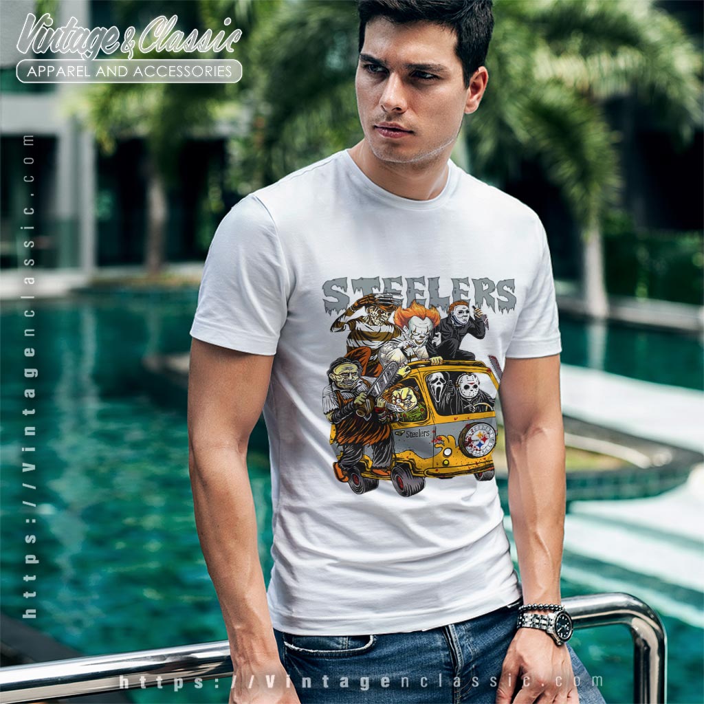 related keywords: Pittsburgh Steelers horror characters Halloween shirt, Steelers Pennywise Freddy Jason tee, horror villains Pittsburgh Steelers fan shirt, Halloween Steelers slasher van design