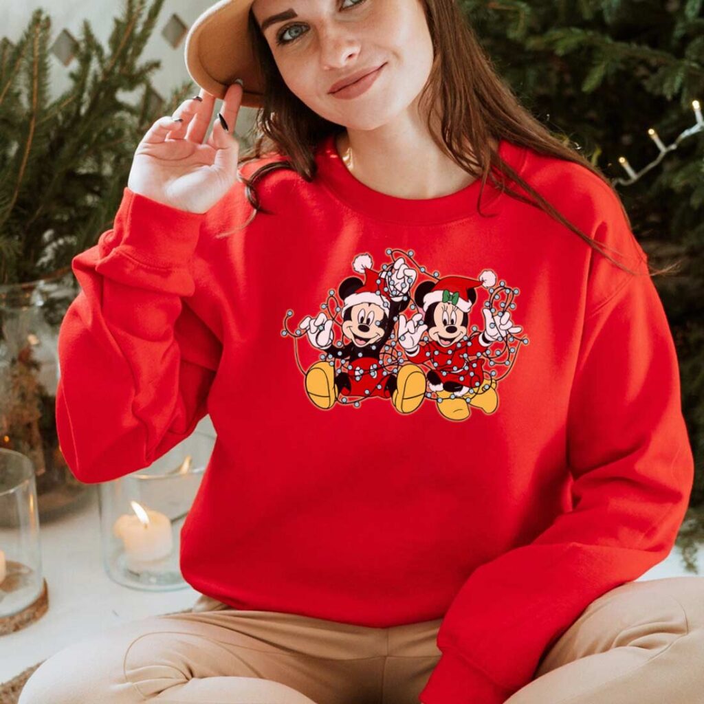 The shirt features a charming design of Mickey and Minnie Mouse decked out in their festive best. Mickey, in his Santa hat, and Minnie, adorned with a holly bow, are wrapped up in a string of colorful Christmas lights. The playful interaction and cheerful expressions of these beloved characters capture the essence of holiday fun and nostalgia. This design is a joyful reminder of the magic that Disney brings to the Christmas season, making it a perfect addition to your festive collection.