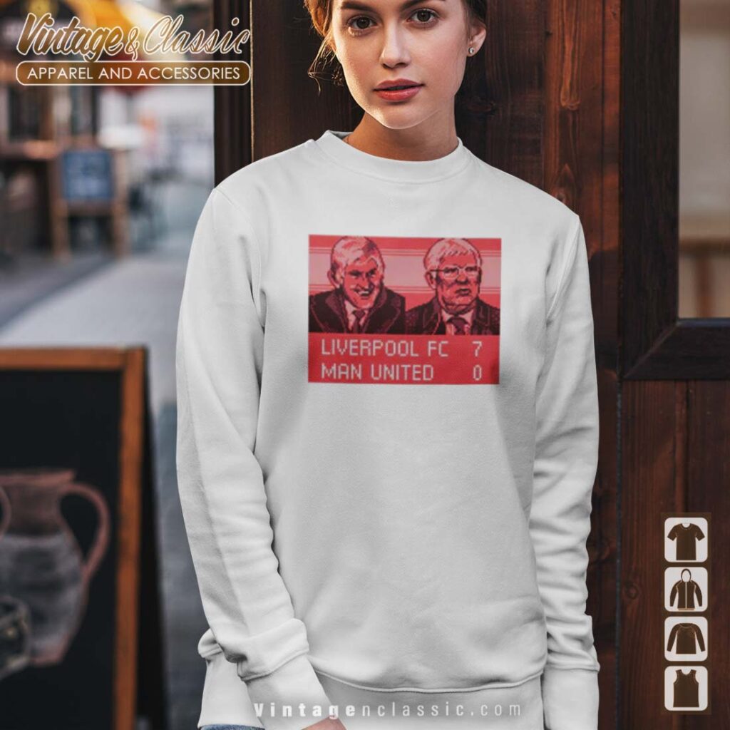 The image on the provided link showcases a vintage shirt worn by Liverpool players during a historic match. The score is clearly visible: Liverpool 7 – 0 Manchester United. This is a significant moment in football history, with Liverpool securing a commanding victory over their rivals. The image captures the excitement and triumph of the occasion.