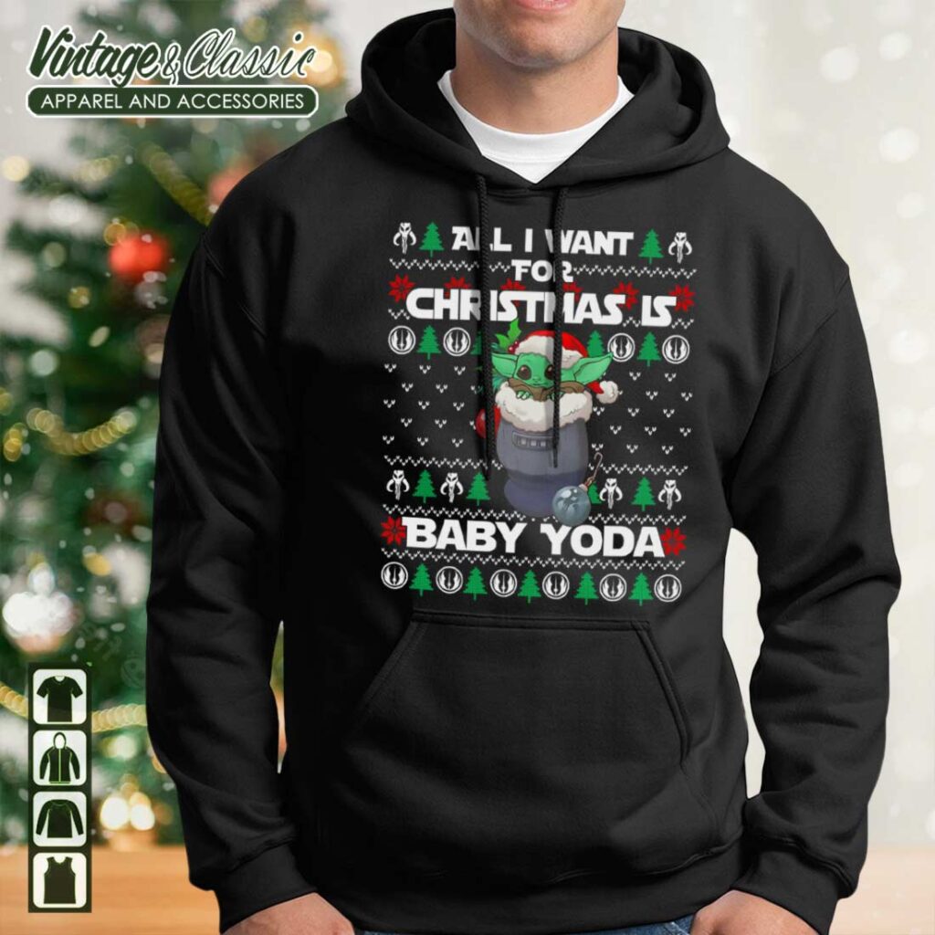 The “Star Wars: All I Want for Christmas Is Baby Yoda Ugly Shirt” is a popular and sought-after item for Star Wars fans. This shirt features the beloved character, Baby Yoda, also known as Grogu, in his iconic and adorable form. The design is a playful and festive take on the popular character, making it a perfect gift or a fun way to show off your love for the galaxy far, far away.