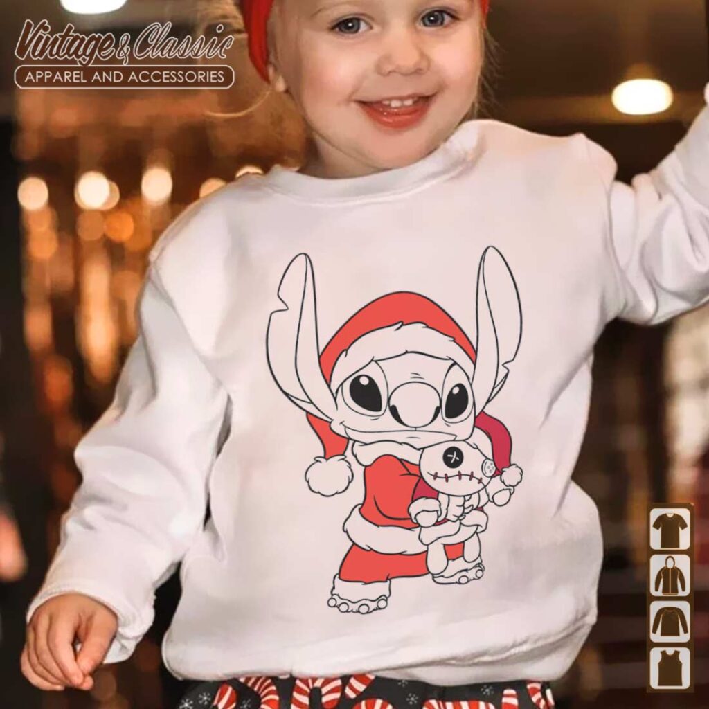 This is a fun and festive T-shirt featuring the beloved Disney character Stitch! He’s sporting a classic Santa Claus outfit, ready to spread some holiday cheer. The design is sure to be a hit with fans of the “Lilo & Stitch” movie and anyone who loves Stitch’s mischievous personality.
