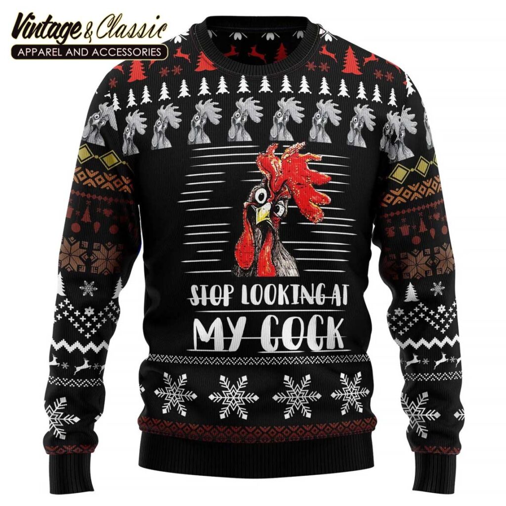 This is a fun and festive Christmas sweater! The “Stop Looking At My Cock” design is a playful and bold statement, sure to turn heads and spark conversation. It’s a unique and eye-catching piece that’s perfect for anyone who wants to embrace the spirit of Christmas with a bit of cheeky humor.