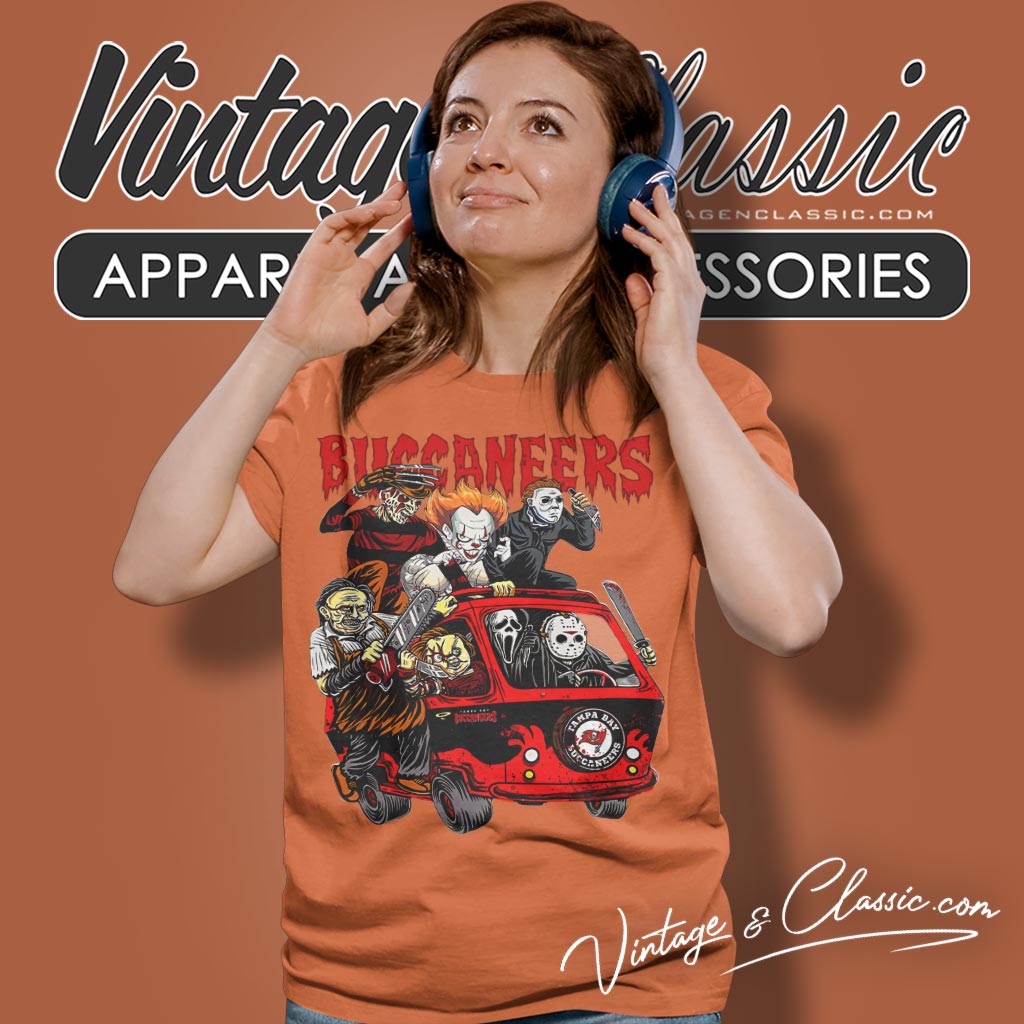 related keywords: Tampa Bay Buccaneers horror characters Halloween shirt, Buccaneers Pennywise Freddy Jason tee, horror villains Tampa Bay Buccaneers fan shirt, Halloween Buccaneers slasher van design