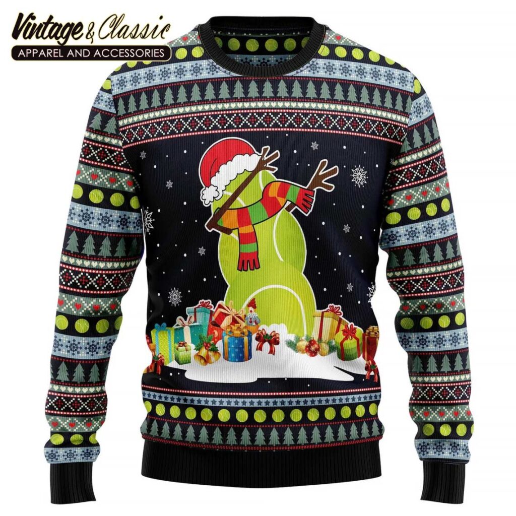 The sweater features a playful snowman design, likely with a tennis racket or ball incorporated into the design. It’s perfect for holiday parties, family gatherings, or just showing off your love for both tennis and Christmas.