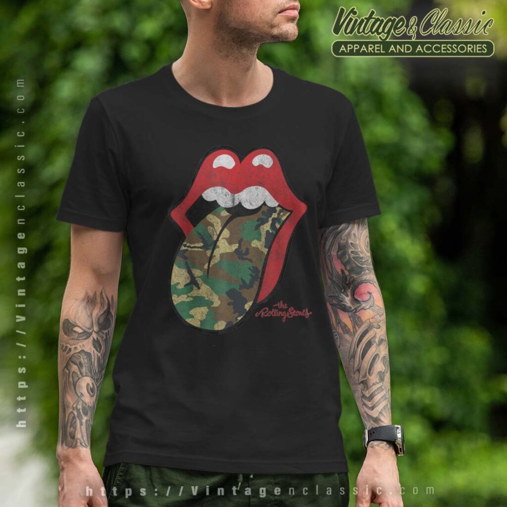 The Rolling Stones Distressed Camo Tongue Shirt is a vintage-inspired piece of clothing that celebrates the iconic rock band, The Rolling Stones. This shirt features a unique design with a distressed camo pattern, adding a rugged and authentic touch to the classic band logo. The tongue of the shirt is emblazoned with a prominent Rolling Stones logo, making it a statement piece for any fan.