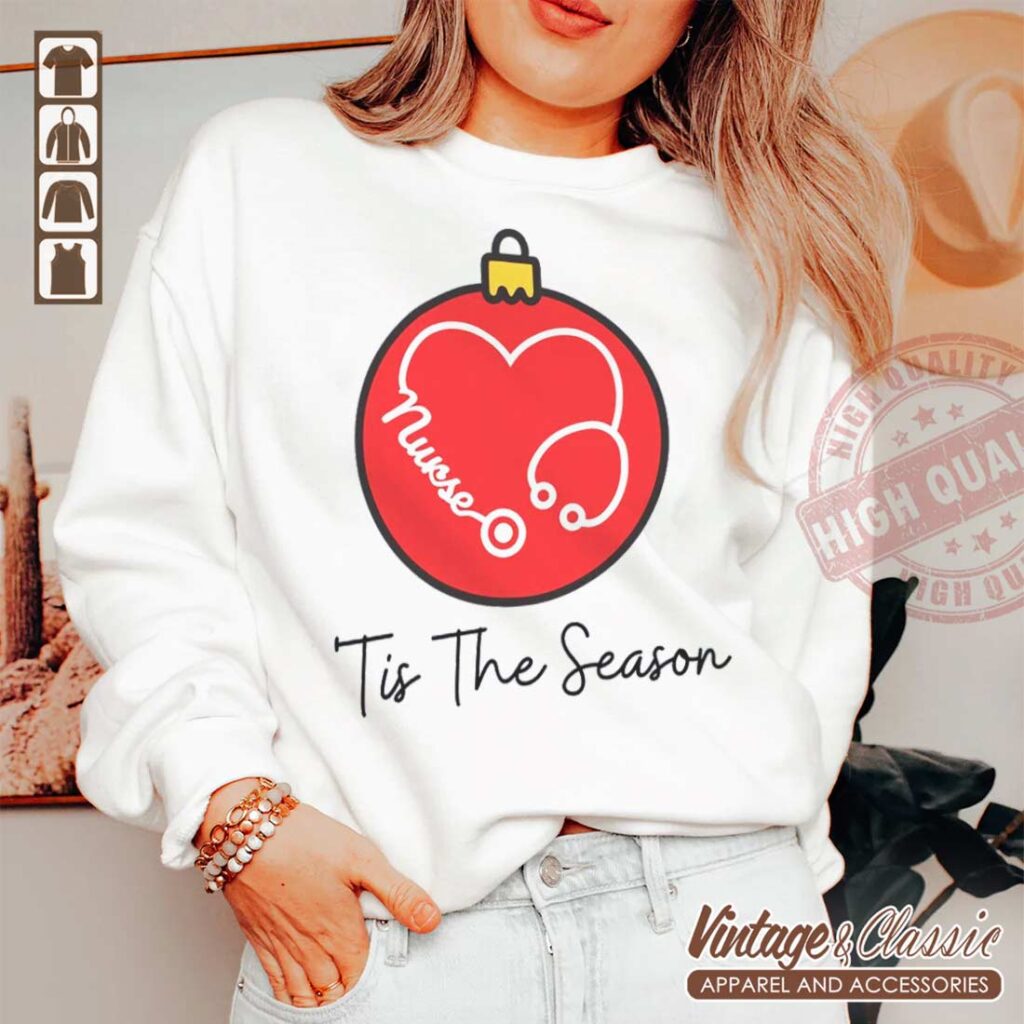 This charming design centers around a vibrant red Christmas ornament, a classic symbol of holiday festivities, topped with a cheerful yellow hanger. Within its festive circle, a beautifully stylized white heart intertwines gracefully with a white stethoscope, symbolizing the deep care and essential tools of the nursing profession. The word “Nurse” is elegantly scripted in flowing white cursive, seamlessly connecting the elements and affirming the wearer’s noble calling. Below this heartwarming ornament, the phrase “Tis The Season” is written in elegant black cursive, perfectly capturing the joyful and giving spirit of Christmas. This artwork is a thoughtful homage to the selfless dedication of nurses, blending the comfort of their profession with the warmth and celebration of the holiday season, making it a truly unique and meaningful piece.