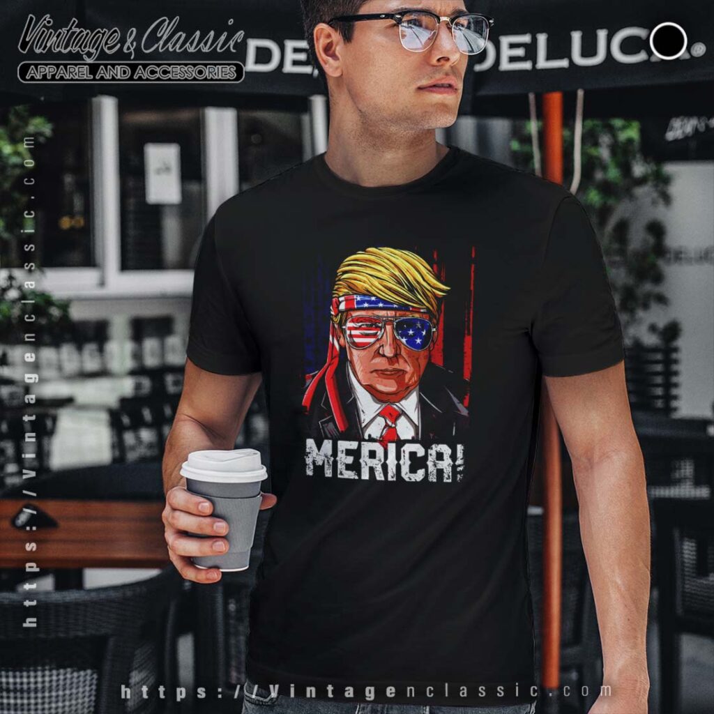 This is a vintage-style T-shirt featuring a design celebrating the 4th of July and American patriotism. The design prominently displays the iconic American flag with a “Trump 4th of July Merica” slogan. This shirt is likely to be a popular choice for individuals who are passionate about the United States and its history.