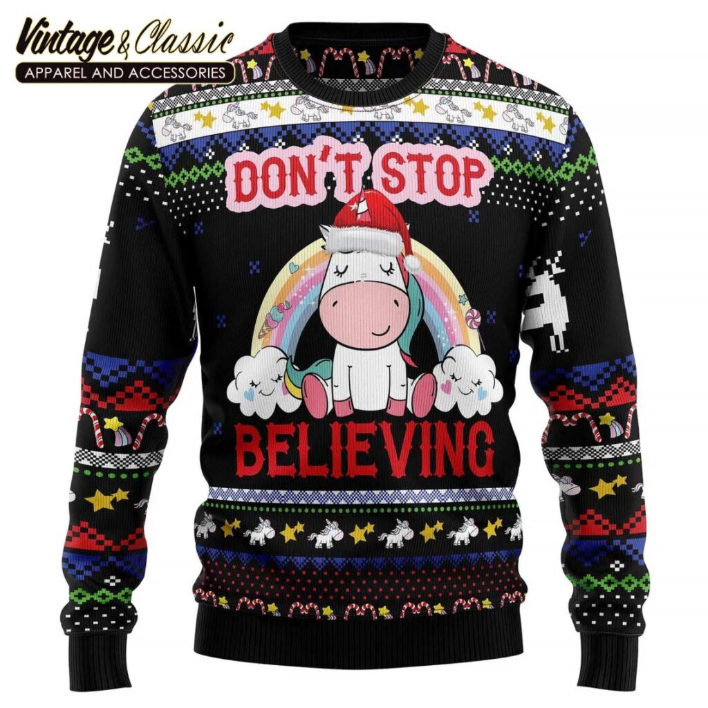 This is a fun and festive Christmas sweater! The “Unicorn Don’t Stop Believing” design is a popular choice for the holiday season. It’s a great way to spread some Christmas cheer and show off your unique style. The sweater features a vibrant unicorn design with a message that’s sure to inspire.